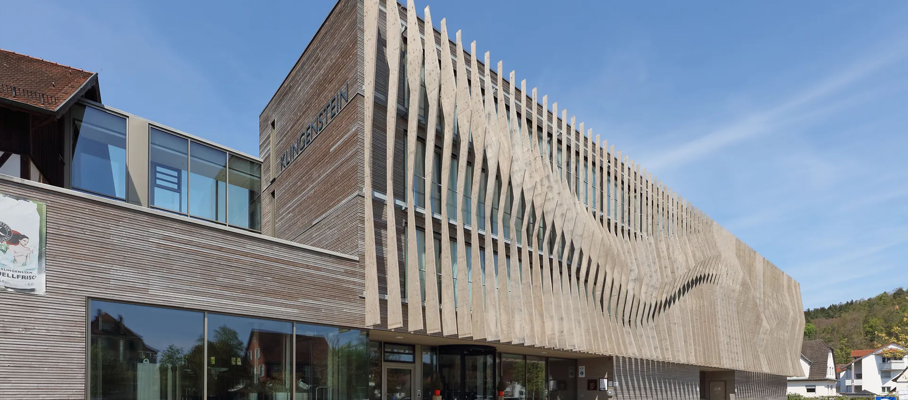 Für das Hotel Klingenstein in Blaustein entstand ein moderner Erweiterungsbau in Modulbauweise. Auf einem massiven Erdgeschoss wurden 63 vorgefertigte Massivholzmodule wie in „Legobauweise“ gestapelt. Die Fassade mit Sonnenschutzlamellen aus Furnierschichtholz greift in einer Wellenform den Fluss „Bläle“ auf. Der Holzbau erfüllt höchste Schall- und Brandschutzanforderungen – funktional, nachhaltig und gestalterisch markant im Zusammenspiel mit dem denkmalgeschützten Altbau.